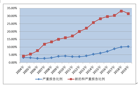 圖2 2004年-2019年新的和嚴(yán)重以及嚴(yán)重藥品不良反應(yīng)/事件報告比例