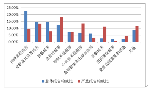 2019年國家基本藥物化學(xué)藥品和生物制品不良反應(yīng)/事件報告,按照藥品類別統(tǒng)計,報告數(shù)量排名前5位的分別是抗微生物藥、心血管系統(tǒng)用藥、抗腫瘤藥、激素及影響內(nèi)分泌藥、治療精神障礙藥;累及器官系統(tǒng)排名前5位的是皮膚及其附件損害、胃腸損害、全身性損害、神經(jīng)系統(tǒng)損害以及血液系統(tǒng)損害。